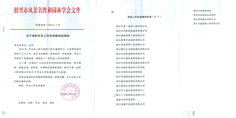 - 三葉園林榮獲"紹興市風(fēng)景園林學(xué)會(huì)工作先進(jìn)集體"