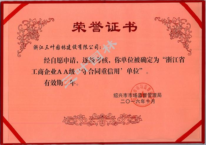 - 三葉園林連續(xù)第四次獲得浙江省工商企業(yè)AA級"守合同重信用"單位