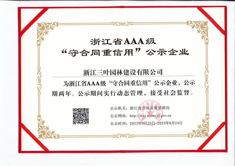 - 三葉園林成功延續(xù) 浙江省AAA級"守合同重信用"企業(yè)