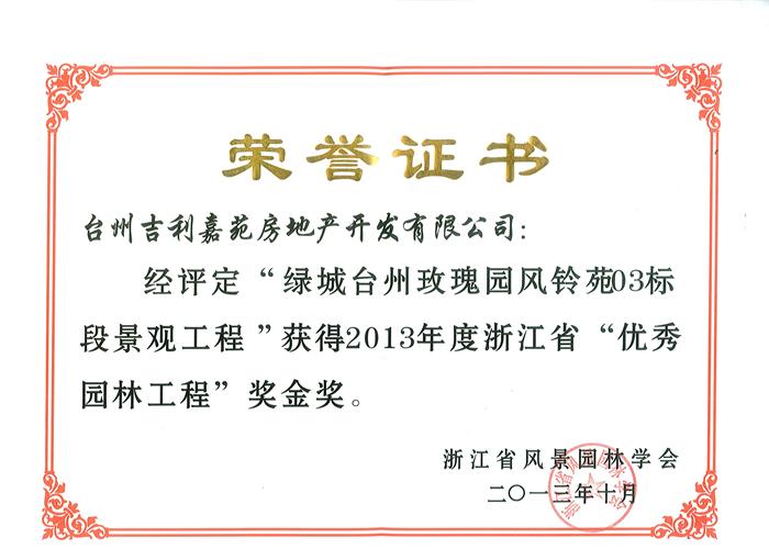 - 熱烈祝賀城臺州玫瑰園風(fēng)鈴苑03標(biāo)段景觀工程榮獲浙江省"優(yōu)秀園林工程獎"金獎