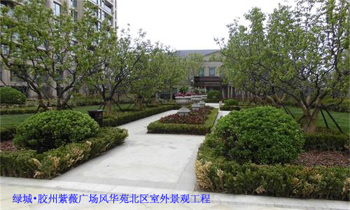 綠城•膠州紫薇廣場(chǎng)風(fēng)華苑北區(qū)室外景觀工程:位于膠州市?趨^(qū)的核心位置,是膠州市最核心的地段,地理位置優(yōu)越,北靠云溪河,南臨膠州市委市政府,緊鄰三里河公園和膠州市三大中心,即會(huì)展中心、文化中心和體育中心。該項(xiàng)目景觀工程總面積約23500㎡(含外圍)。其中,綠化面積約 16000㎡,土建面積7500㎡。綠化率達(dá)68%,建筑內(nèi)容為多層住宅,另有商鋪配套等。室外硬質(zhì)景觀工程包廊架、水景、花池、硬質(zhì)基礎(chǔ)、貼面等,軟景景觀工程包含場(chǎng)地整平、選苗號(hào)苗、喬灌木種植、草坪鋪設(shè)、養(yǎng)護(hù)管理等。植物配置: 主要選用植物品種有:山玉蘭、紫玉蘭、山杏、櫻花、海棠、紫薇、美國(guó)紅楓、紅葉李、石楠、冬青、杜鵑、八仙花、女貞等各種灌木為配景。地被植物為花葉絡(luò)石、常綠草坪等。做到常綠、落葉相結(jié)合;大喬、灌木本結(jié)合,鄉(xiāng)土樹種與外引品種相結(jié)合,整個(gè)小區(qū)植物配置自然,層次豐富、提升綠地的景觀效果。