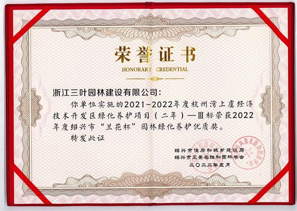 • 2021-2022年度杭州灣上虞經濟技術開發(fā)區(qū)綠化養(yǎng)護項目(二年)—Ⅲ標喜獲紹興市蘭花杯